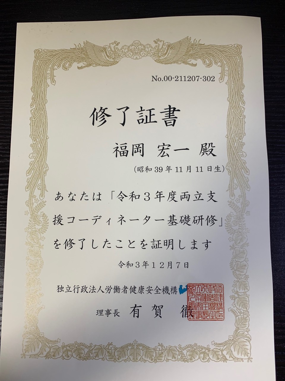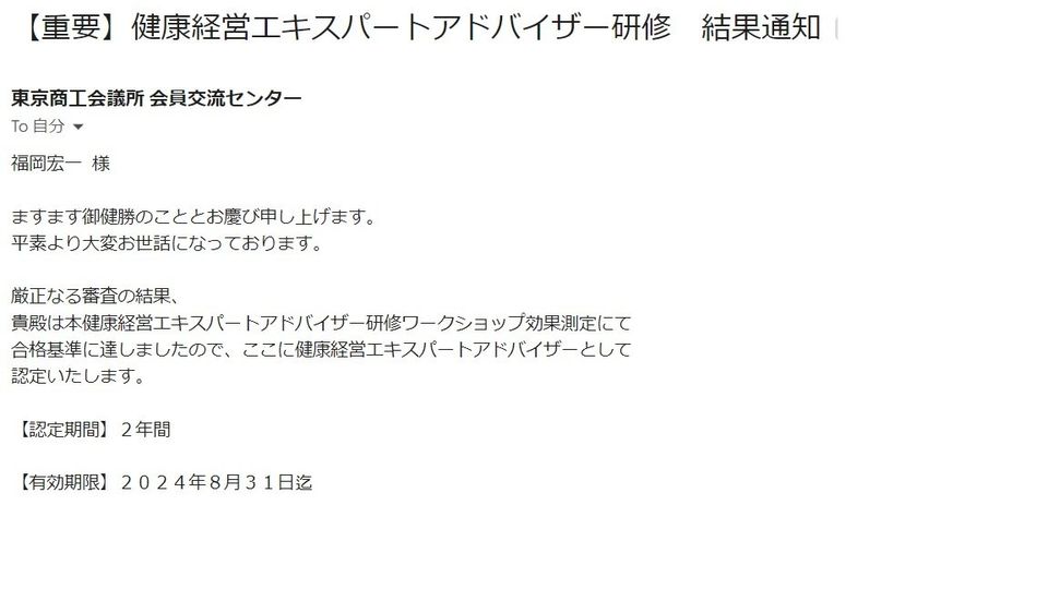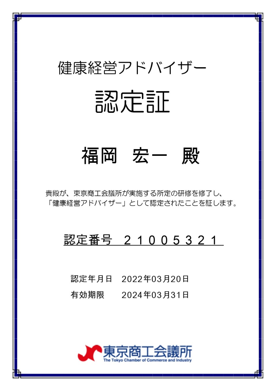 健康経営エキスパートアドバイザーに認定されました。健康経営エキスパートアドバイザーは健康経営に取り組む中小企業に対して、課題を抽出・整理し、課題解決に必要な取り組みを企業等に提案しサポートをしていきます。